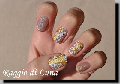 Here is my stamping manicure Golden flowers on silver holo, I hope you like it! :-)